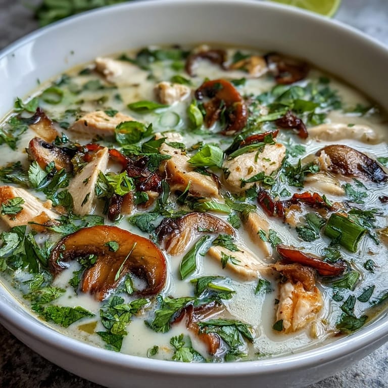 Save Experience the soul-warming flavors of Authentic Tom Kha Gai, a classic Thai soup that perfectly balances creaminess with citrusy brightness. This fragrant dish features tender chicken thighs simmered in a rich coconut milk broth, infused with the essential trio of lemongrass, galangal, and makrut lime leaves for an unmistakably traditional taste.