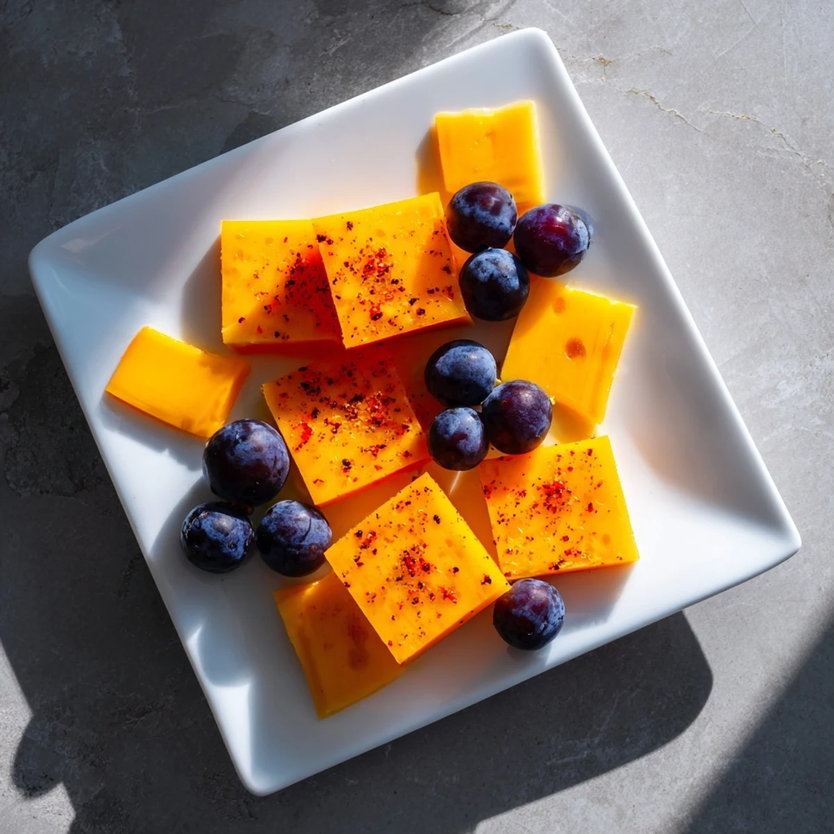- Brush the pepper squares very lightly with olive oil—just enough to catch light and deepen the color. Sprinkle a tiny pinch of sea salt and fresh pepper over the peppers only, leaving the cheese and grapes plain to taste their natural flavors.