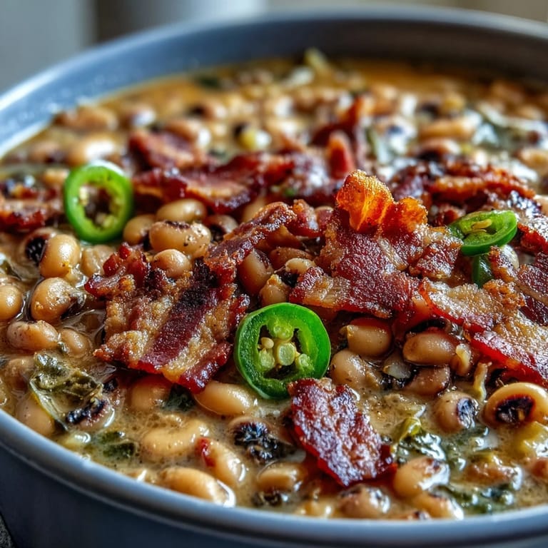 Save My uncle pulled me into his kitchen on a cold January afternoon, the kind of day when the world outside felt gray and distant. He had this massive blue Dutch oven sitting on the stove, and before I could ask what we were making, the smell hit me—bacon sizzling, jalapeños releasing their heat, that unmistakable perfume of Texas comfort food. Turned out he'd been making this exact pot of black-eyed peas for forty years, and he decided that day I finally needed to learn it. The recipe is deceptively simple, but watching him work, I realized it wasn't about the ingredients—it was about respecting each layer of flavor as it built.