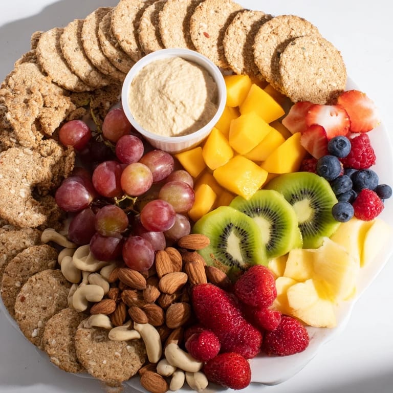 Create an outer ring with upright crackers, nestle nuts between them, then mound the fresh fruits in the center, placing dips within the fruit circle.