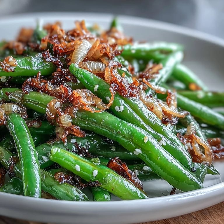 The blanching and ice bath step is essential for achieving that perfect crisp-tender texture and vibrant green color. Don't skip this step, as it prevents the beans from becoming mushy during the sauté. When cooking the garlic, watch it carefully—it should become fragrant but not browned, as burnt garlic can turn bitter. For extra flavor, consider adding a splash of oyster sauce or a pinch of grated fresh ginger when sautéing the garlic. Make sure to add the crispy fried onions just before serving so they maintain their satisfying crunch rather than becoming soggy from the heat and moisture of the beans.
