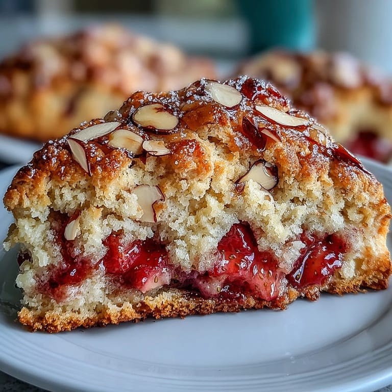 The secret to exceptional scones lies in two key techniques: keeping your ingredients cold and handling the dough with a light touch. When you incorporate chilled brown butter into the flour, it creates pockets that steam during baking, resulting in those coveted flaky layers. The addition of fresh strawberries not only adds natural sweetness but also keeps the interior wonderfully moist, while the almond slices scattered on top toast beautifully in the oven, adding both visual appeal and a satisfying crunch.